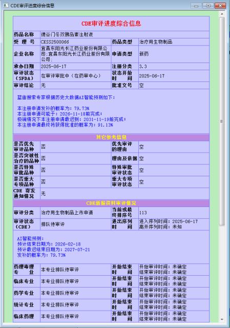 企业版黄金版的使用方法为:查询“CDE审评进度综合信息”,未完成审批的品种,其结果报表里就会显示AI智能预测信息。如下图所示: