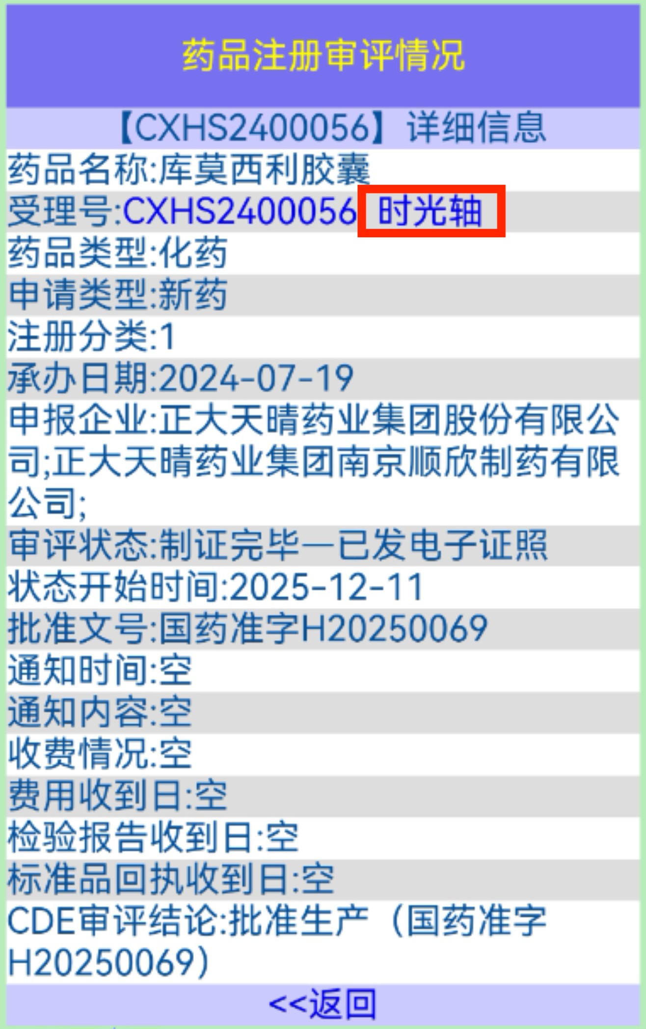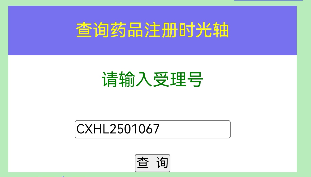 在手机版的主界面点击“药品注册时光轴”,输入受理号:
