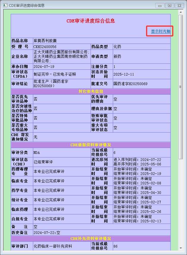 电脑端的企业版和黄金版用户,查询“CDE审评进度综合信息”的结果报表里,可以点击“显示时光轴”链接: