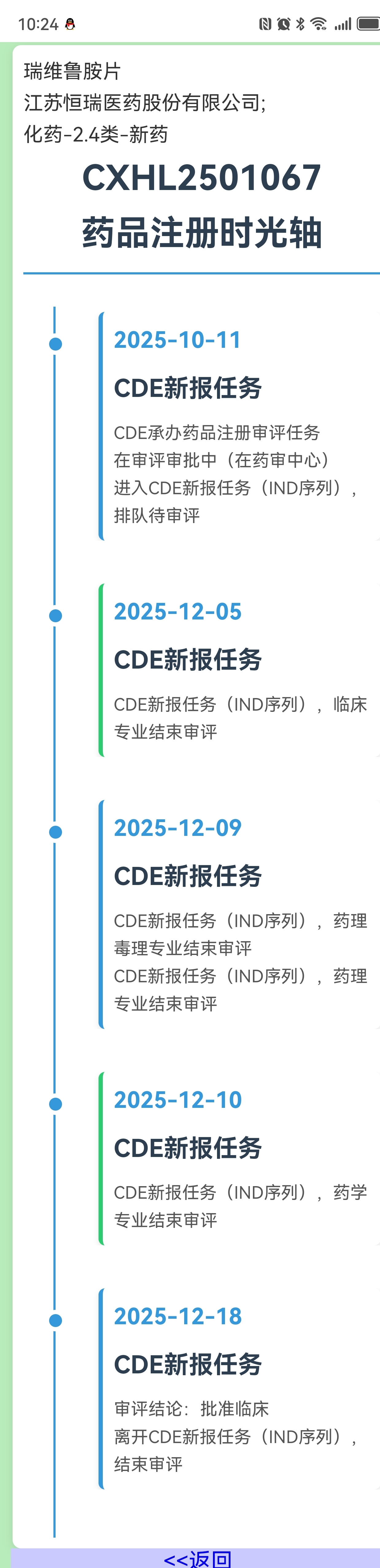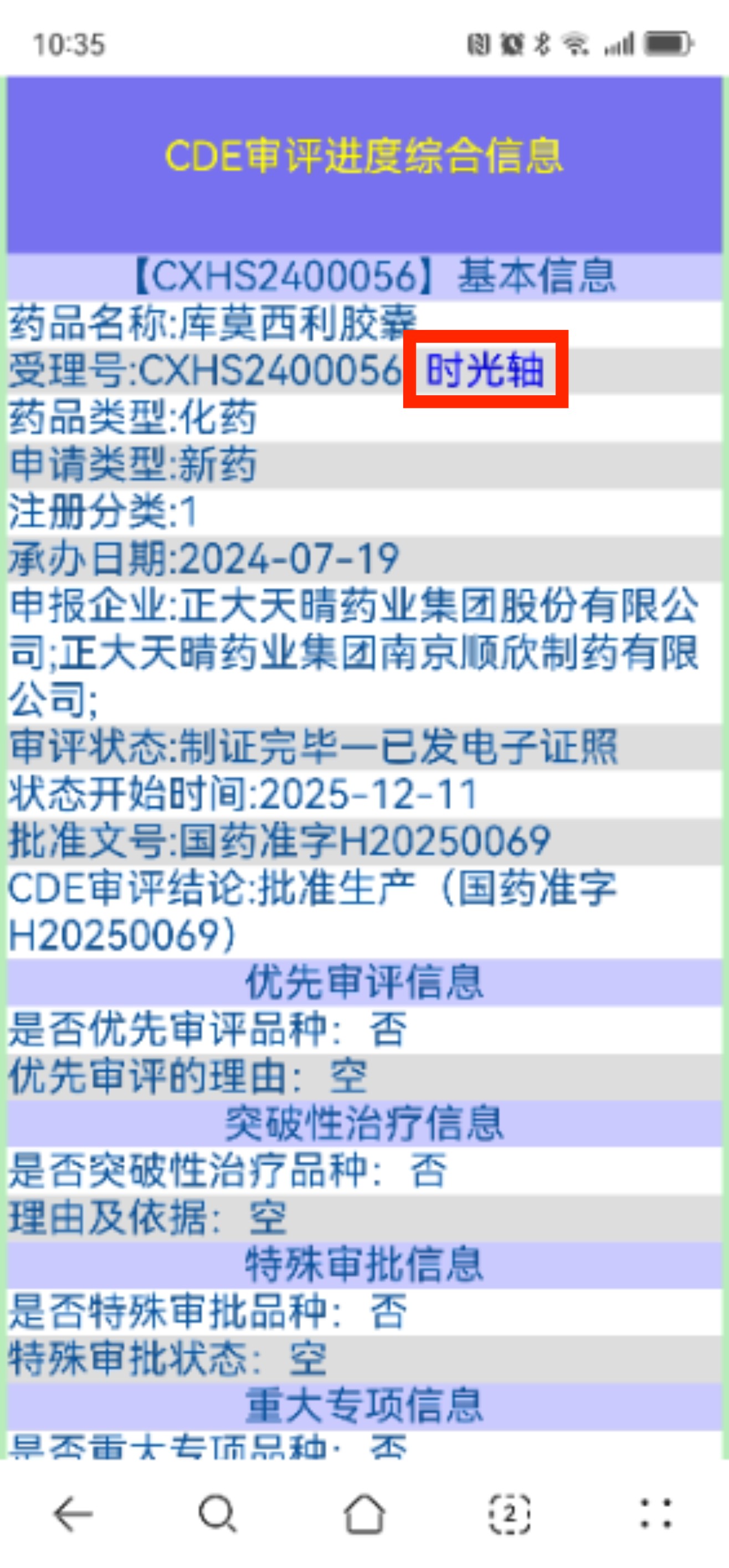 或者使用手机版查询“CDE审评进度综合信息”时,在查询结果的受理号旁边也有“时光轴”链接,点击即可查看相应的药品注册时光轴,如下:
