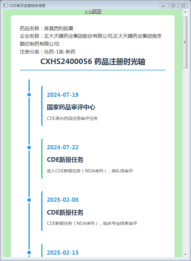 近日,国家药品审评中心受理品种搜索专家的手机版、企业版、黄金版均增加了以时光轴的模式显示“CDE审评进度综合信息”的功能,方便用户可以按时间顺序了解药品注册的历史进展情况。